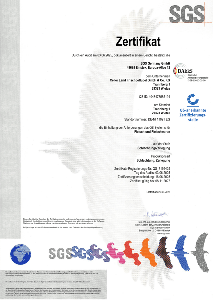 Landgeflügel specialises in the production of fresh chicken parts. Our basic assortment is available in any desired packaging unit. The products can be packaged in a protective atmosphere or under vacuum. At a storage temperature below 4 °C, we guarantee a minimum shelf life of 10 days.